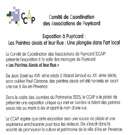 Du 12 au 23 septembre 2025, la salle des mariages de la Mairie de Puyricard accueillera une exposition organisée par le Comité de Coordination des Associations de Puyricard (CCAP) : « Les Peintres aixois et leur Rue »
